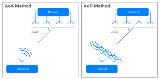 最新藍(lán)牙標(biāo)準(zhǔn)(5.1)允許系統(tǒng)使用天線陣列來確定通信方向(圖3)。使用天線陣列的單個(gè)設(shè)備可以與任何其他藍(lán)牙設(shè)備一起確定彼此的相對(duì)方向。這是通過測(cè)量到達(dá)角(AoA)或離開角(AoD),這取決于通信的方向和哪個(gè)設(shè)備有天線陣列。